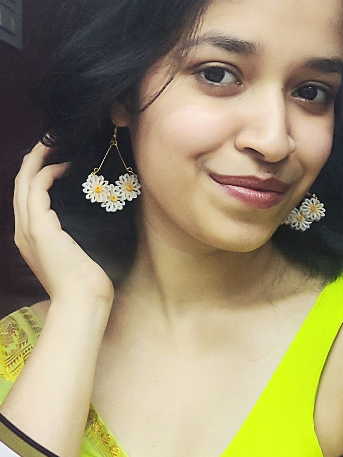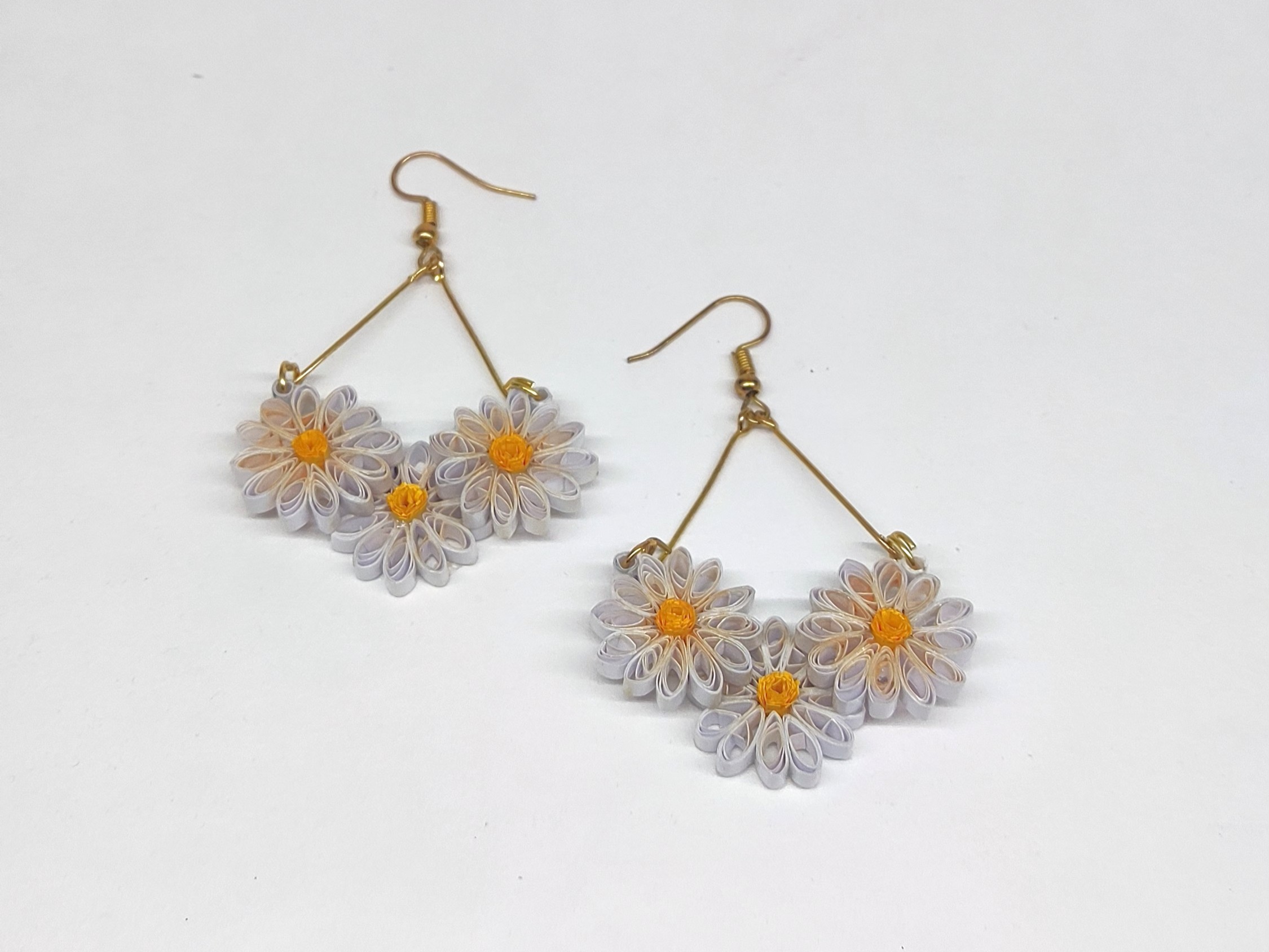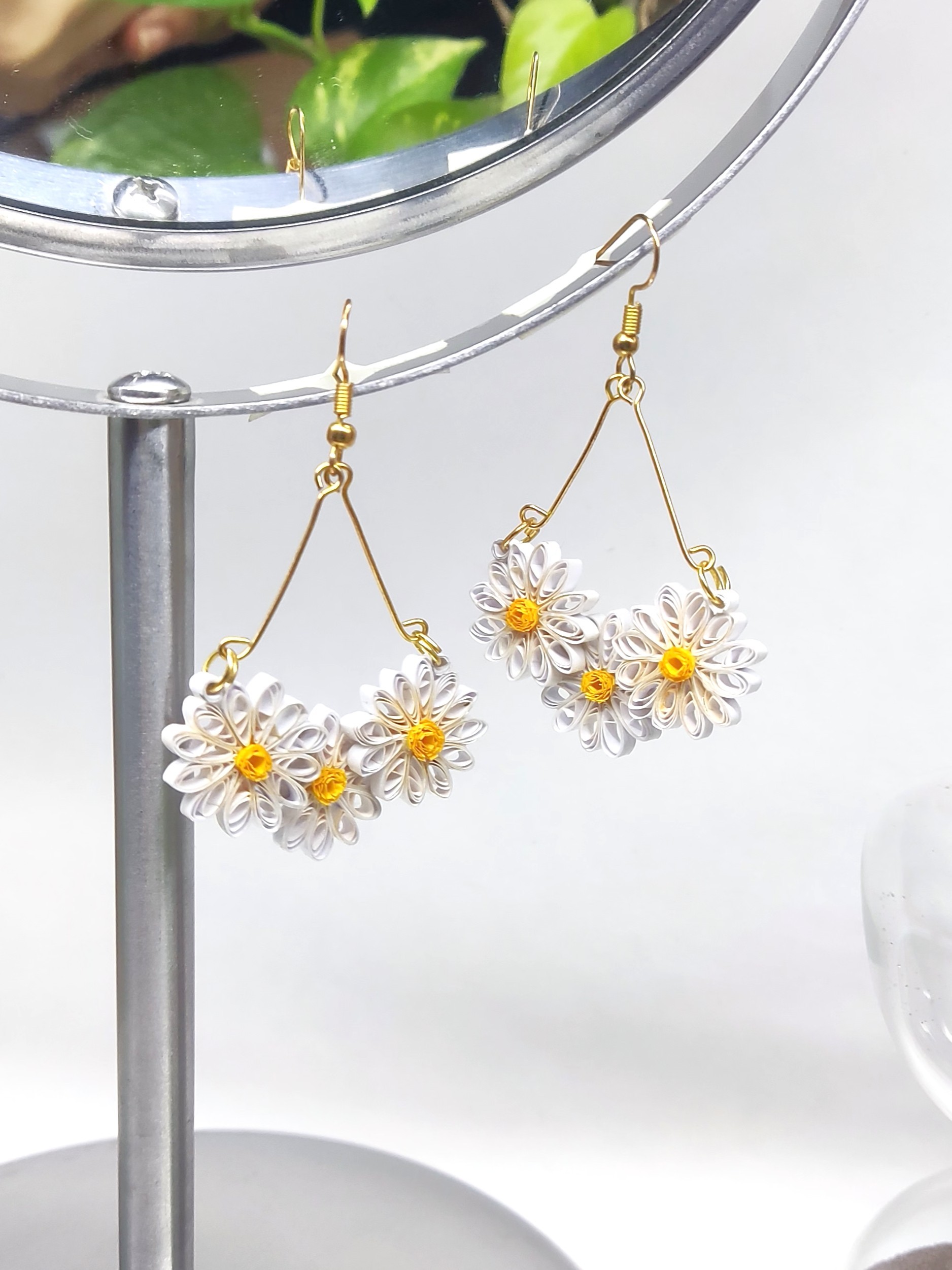 Adorn your ears with the fresh charm of a blooming daisy field. These 'Daisy Bloom' earrings, crafted from delicate paper quilling, feature a cluster of pristine white daisies with sunny yellow centers. Lightweight and cheerful, they're a perfect touch of springtime for any day.